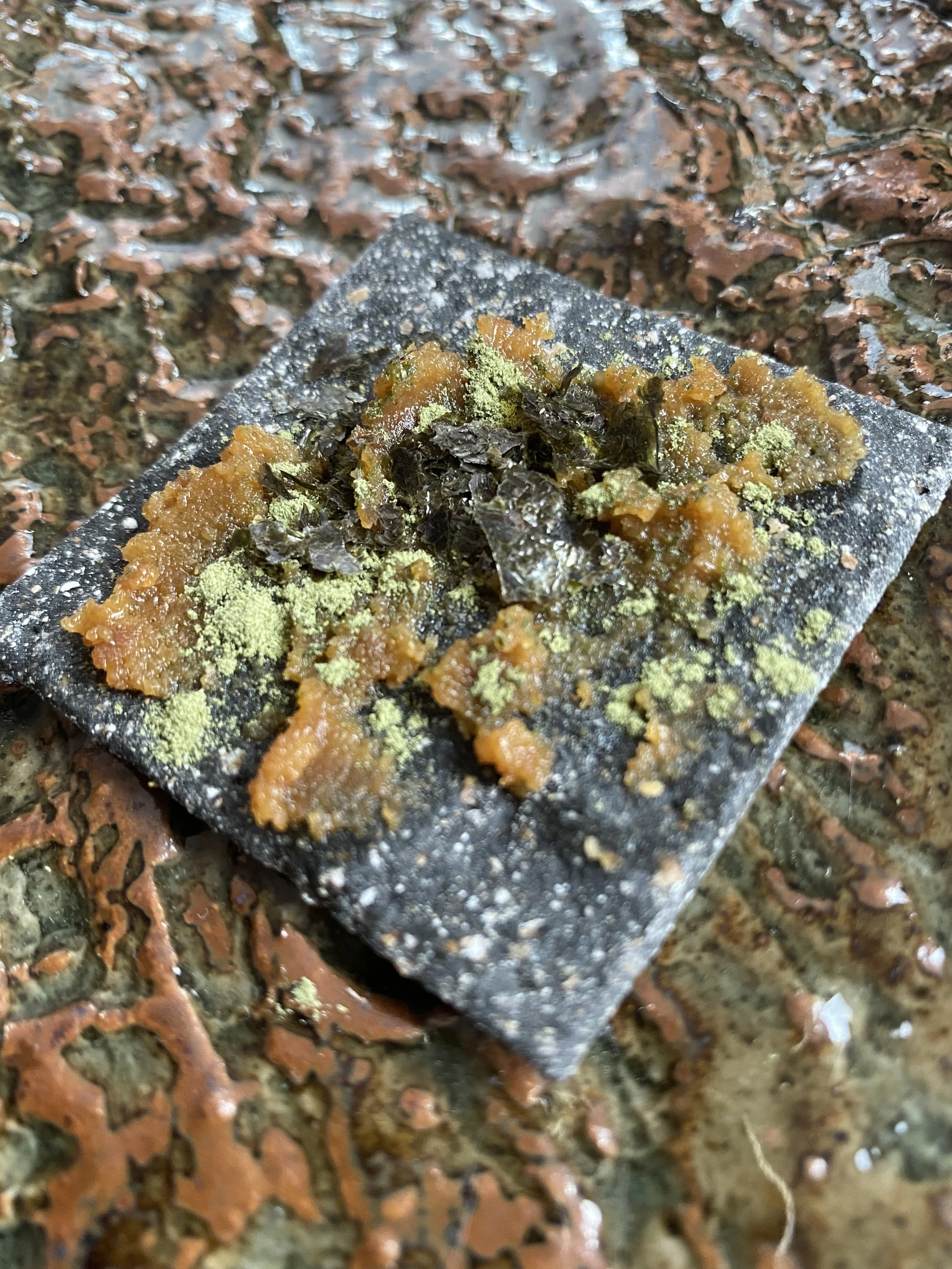 An unattended drip created a wall of moss and plant growth on Spencer Street. This is how I reimagined it in food - Charcoal Cracker, Miso/Tahini, Nori, Matcha.