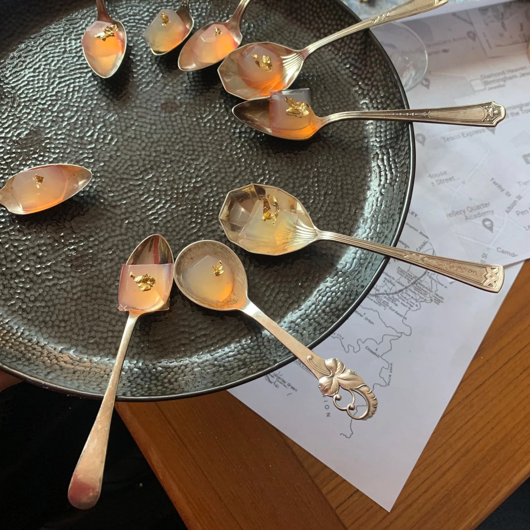 An edible re-imagining of ‘jewels’ - opalescent jellies served on vintage silver spoons in a nod to Elkington’s silver plating in the JQ (1840-still going strong).